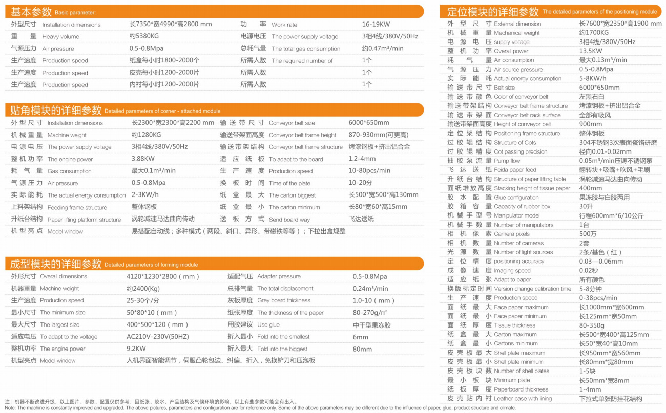 該機(jī)主要分為定位模塊、貼角模塊和成型模塊三大部分,可實(shí)現(xiàn)各類紙盒、木盒、膠盒生產(chǎn)時的自動送紙、自動過膠、自動貼角、自動定位、自動成型和自動壓泡等,系列工藝工序的自動完成,轉(zhuǎn)版速度快,制作盒體精美。定位模塊的黑白皮帶、雙鏡頭、自動糾偏、皮殼板貼襯定位、五片板定位。貼角模塊的不粘膠膠帶槽、雙升紙臺。成型模塊的智能調(diào)節(jié)、自動鎖固、伺服凸輪動作、免換鏟刀和壓泡板等,均由我司自行研發(fā)設(shè)計(jì)生產(chǎn),并獲得多項(xiàng)國家專利。